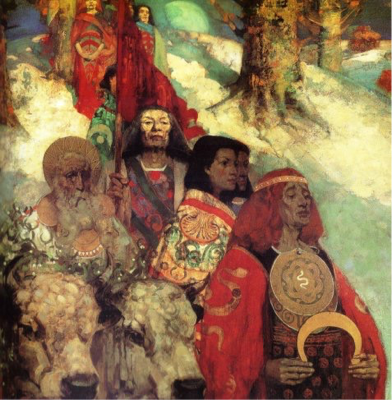 In 1890 Henry and Hornel had collaborated on ‘The Druids Bringing in the Mistletoe’. This painting, writes John Morrison, one of the leading contemporary Scottish art historians (and no stranger to a good indepedence art debate as this article plus comments shows) put them firmly at the forefront of the Celtic Revival in Scotland. The Revival was all about rediscovering a national identity independent of England, no easy task considering Scots had spend the last fifty years joining in the colonisation of half the world. To deal with this, Hornel and Henry delved back into the ancient past, something Hornel had been doing for years with his interest in the ancient standings stones of Galloway. Indeed, it seems to have been the younger artist who was the more influential, drawing Henry away from French-influenced landscapes towards these mystic themes and a more radical use of colour.