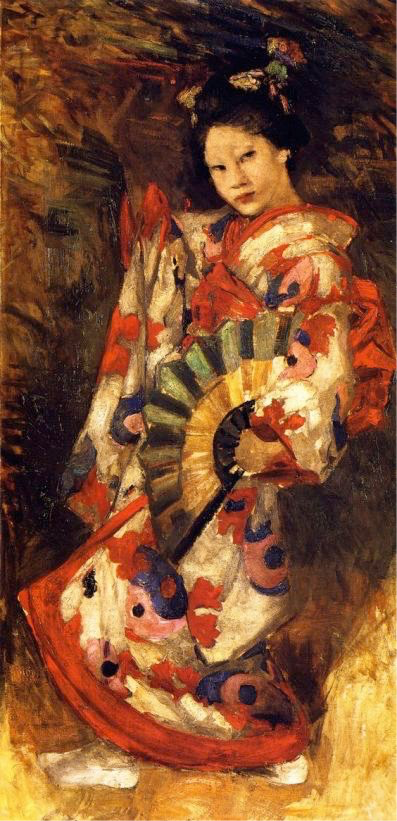 If there is one thing that Hornel seemed to take from Japan it was an equation of beauty with the feminine. It wasn’t only that while he was there most of his paintings were of young Japanese women and girls in traditional costume, with fans poised at just the right angle. Even after he returned home he kept painting these girls. Except now he had Scottish ones to pose in their place, using photographs he’d obtained in Japan to make sure the positions and angles were the same. From 1901 he painted them in the grand old house he bought in his hometown of Kirkudbright, thanks to the money he’d made from the sale of his Japan work.