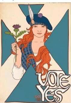 In the summer of 2014, a couple of months before Scotland’s independence referendum, I was walking down Leith Walk in Edinburgh when someone handed me a Vote Yes postcard. On it was a print of a young woman emerging from a Saltire, her long red locks tumbling out from under a tam o’ shanter bunnet, her eyes saying: don’t mess with me pal. She looked as if she might have been modelled on a barmaid with a good line in put downs, except instead of a pint of Caley ’80 she was offering up a thistle.